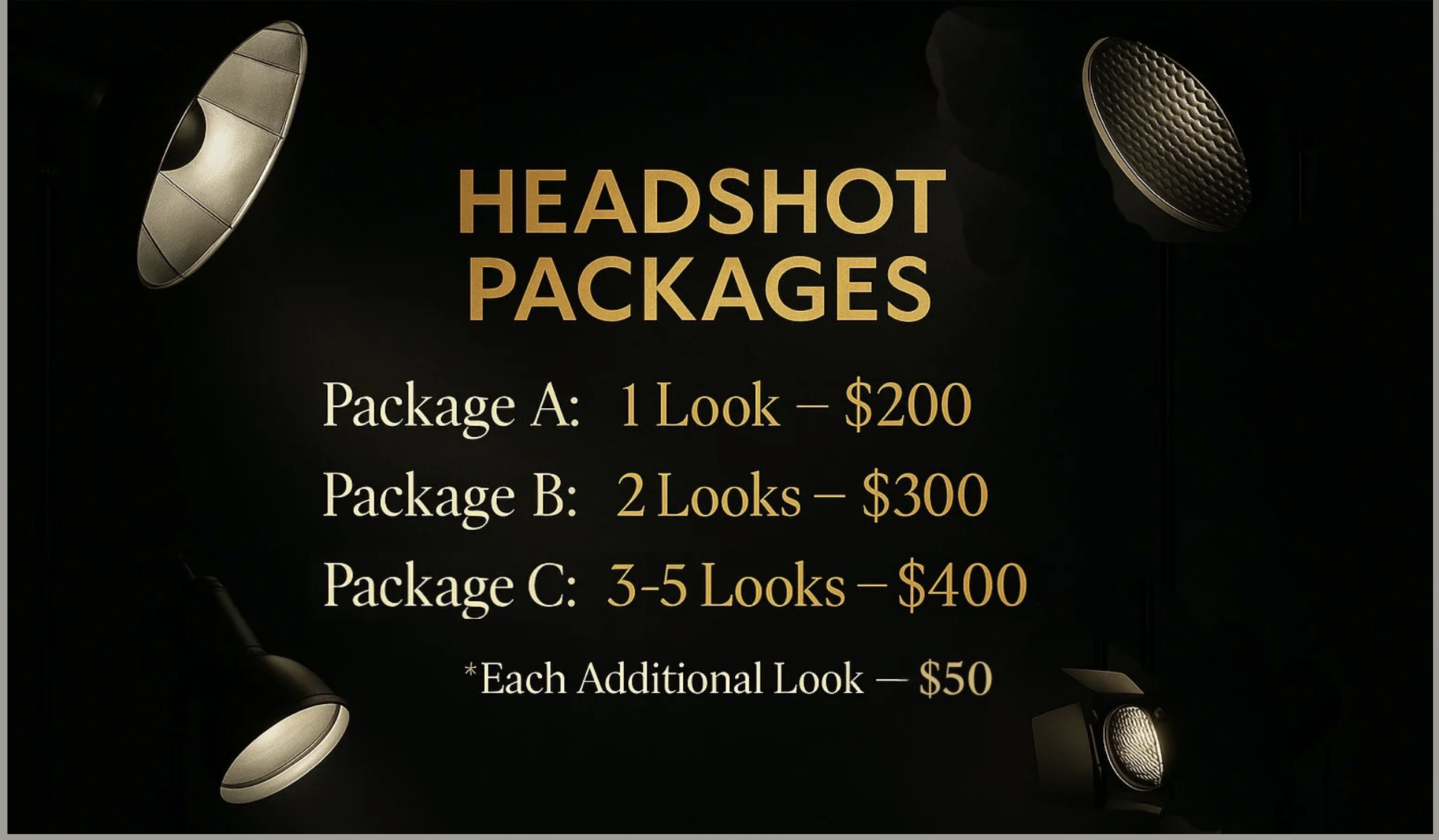 A look refers to a complete outfit and setup — including wardrobe, lighting, and background — range anywhere from 60 to 100 photos designed to showcase a specific version of you. Each look is tailored for different goals, whether it's commercial, theatrical, business, or personal branding.